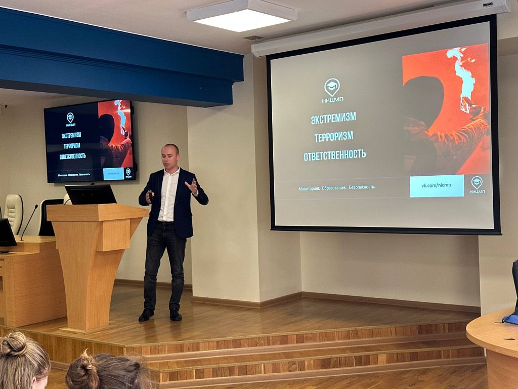 Юрий Андреевич провел лекцию о противодействии идеологии терроризма. Спикер подробно рассказал о том, какие бывают разновидности терроризма, способы вовлечения в террористическую деятельность, что такое вербовка. На лекции были перечислены статьи законов, по которым могут быть привлечены люди, участвующие в террористической деятельности.